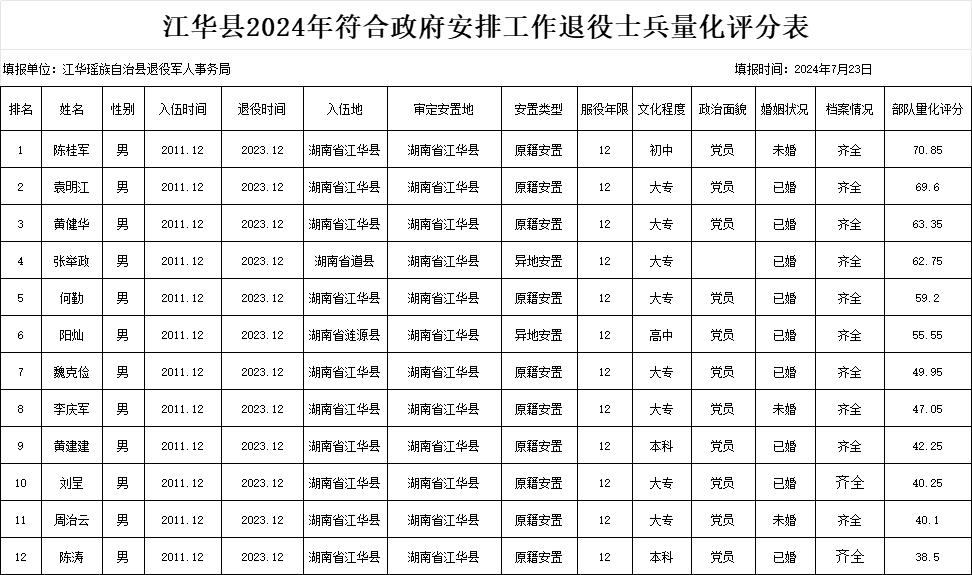 江华县2024年符合政府安排工作退役士兵量化评分表