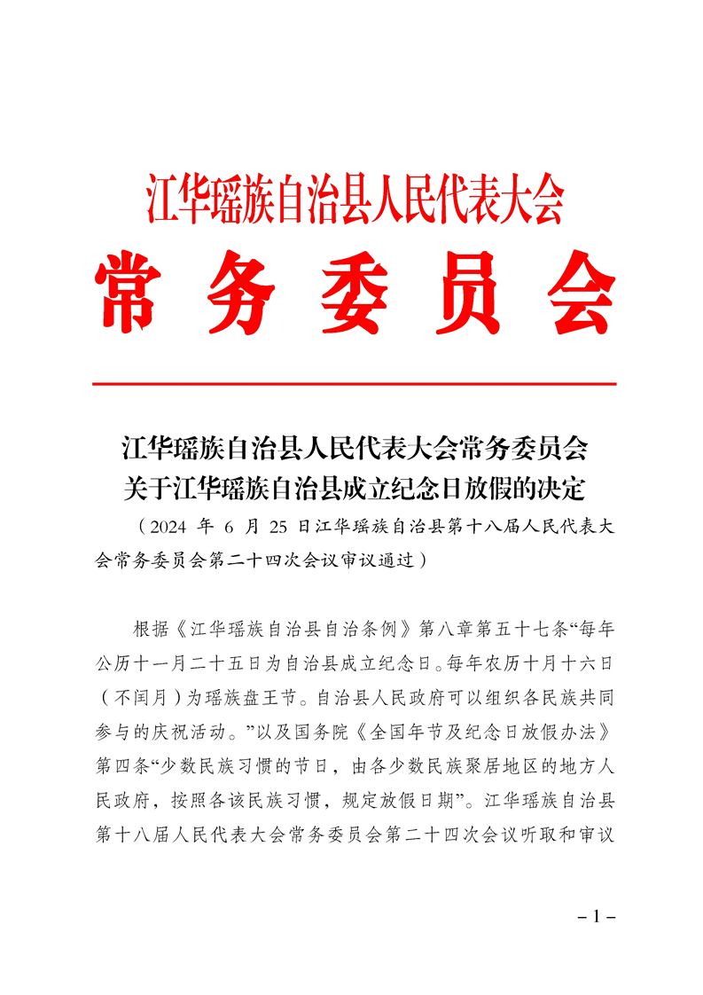 江华瑶族自治县人民代表大会常务委员会关于江华瑶族自治县成立纪念日放假的决定