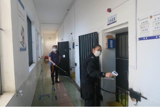 抗击疫情期中,看守所组织人员对大院、办公区、会见区、提审区和监区进行地毯式消毒杀菌,确保环境卫生整洁;对新入所嫌疑人采取严格的体检和病毒筛查,单独隔离过渡关押,防止将病毒带进监所;严格控制外来人员接近监区,暂停家属会见、律师会见、开庭等业务;每日组织人员对监区及办公区进行消杀,及时消除卫生死角;实行监所医生24小时巡查制,对工作人员及在押人员2次体温测试,每天对监室至少进行1次消毒,确保监区卫生状况良好,在押人员身体健康。