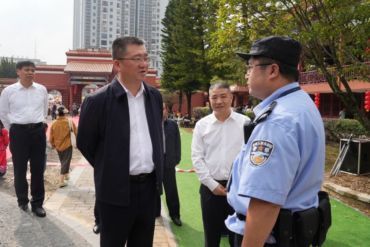 在江华瑶族自治县盘王殿广场,夏葛桉详细了解各执勤点位的警力部署、勤务安排等情况,认真听取相关工作情况汇报,看望慰问执勤一线民辅警。他指出,广大公安民辅警要强化“群众过节、公安过关”意识,继续发扬优良作风,严格落实勤务要求,做到“白天见警车、晚上见警灯、日夜见警察”,切实提升街面见警率、管事率。要进一步加强风险评估预警,严防极端案事件发生,为群众欢度节日保驾护航。