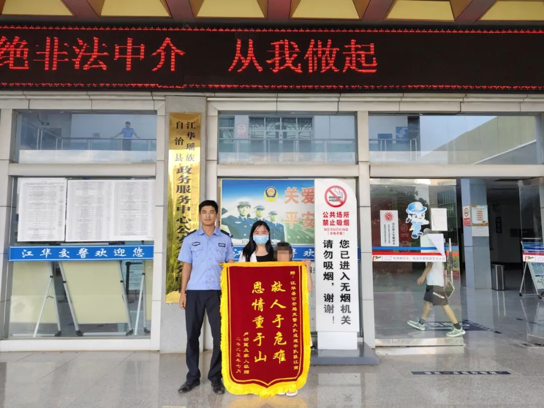 7月7日下午,江华瑶族自治县公安局交警大队迎来了一位特殊的访客——李女士手持一面印有“救人于危难 恩情重于山”的锦旗,紧紧握住辅警陈江南的手,声音哽咽:“多亏了你!那天如果没有你及时相救,我的孩子可能就没了……”