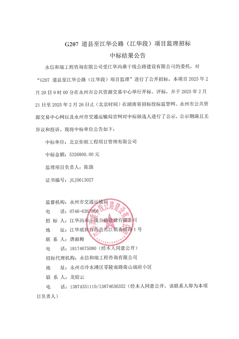 G207 道县至江华公路(江华段)项目监理招标中标结果公告
