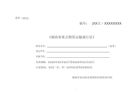 为统筹做好应急物资保障和交通管控工作,根据省、市《关于统筹做好道路货运疫情防控和重点物资运输保障工作实施方案》要求,现就我县办理《湖南省重点物资运输车辆通行证》办理流程相关事项,公告如下: