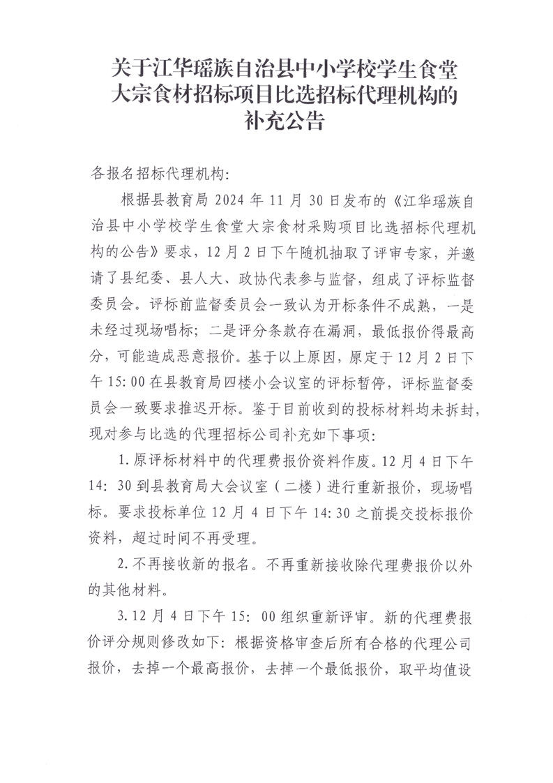 关于江华瑶族自治县中小学校学生食堂大宗食材招标项目比选招标代理机构的补充公告