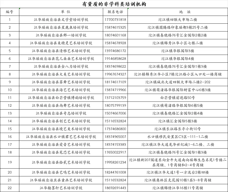 3.审慎选择和参加非学科类校外培训。如有选择艺术、体育、科技等非学科类培训需求时,请注意以下方面:一看:察看办学场所。报培训班前,要实地察看培训机构的办学场所,选择房屋安全、场地宽敞、设施齐全、消防通道畅通等有安全保障的合规培训机构。二查:查看办学资质。要注意查看校外培训机构是否在信息公示栏中公示《民办学校办学许可证》《营业执照》《民办非企业单位登记证书》等证照情况以及收费项目、收费标准、教师资质等信息,不要选择办学资质不全的“黑机构”。三防:严防各类违规收费,保护好自身合法权益。一是务必通过手机应用商店下载“校外培训家长端”APP进行购课缴费,切勿通过微信、支付宝等方式将培训费用支付到培训机构私人账户。二是要自觉抵制校外培训机构以各种优惠、折扣、送课等方式诱导的超时段、超限额收费(一次性收费超过3个月或60个课时,或者一次性收费超过5000元的)。三是务必签订培训服务合同。请家长朋友缴费时务必主动与培训机构签订由教育部和市场监管总局制定的《中小学生校外培训服务合同》(2021年修订版)并索取正规发票。(附:目前我县有证的非学科类培训机构)