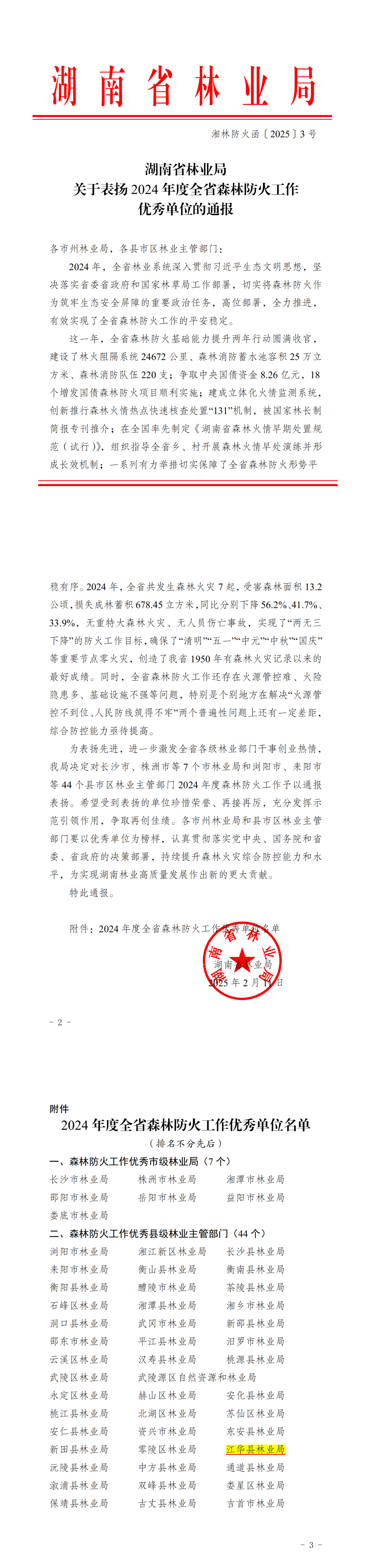 近日,湖南省林业局发文通报表彰,江华瑶族自治县林业局荣获“森林防火工作优秀县级林业主管部门”称号。