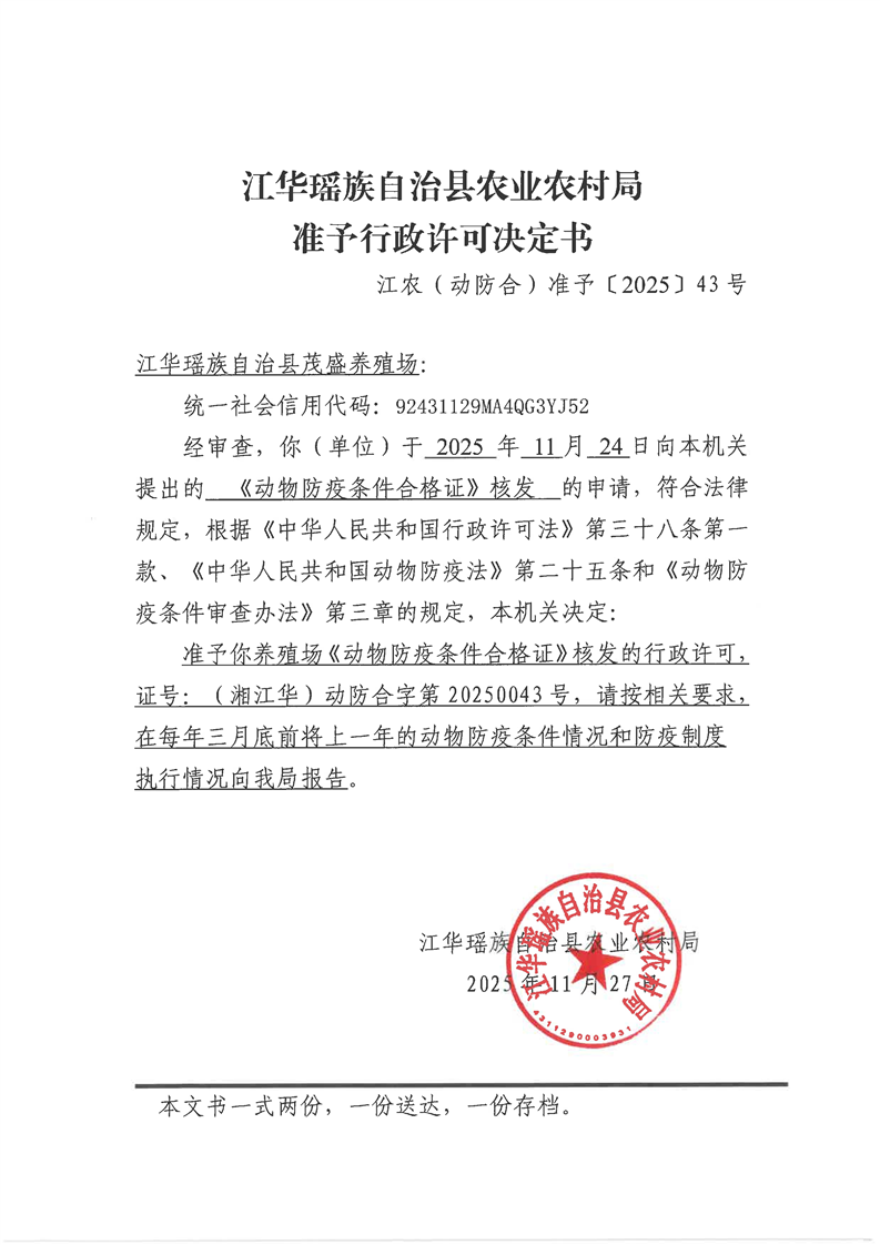 名称: 江华瑶族自治县农业农村局准予行政许可决定书