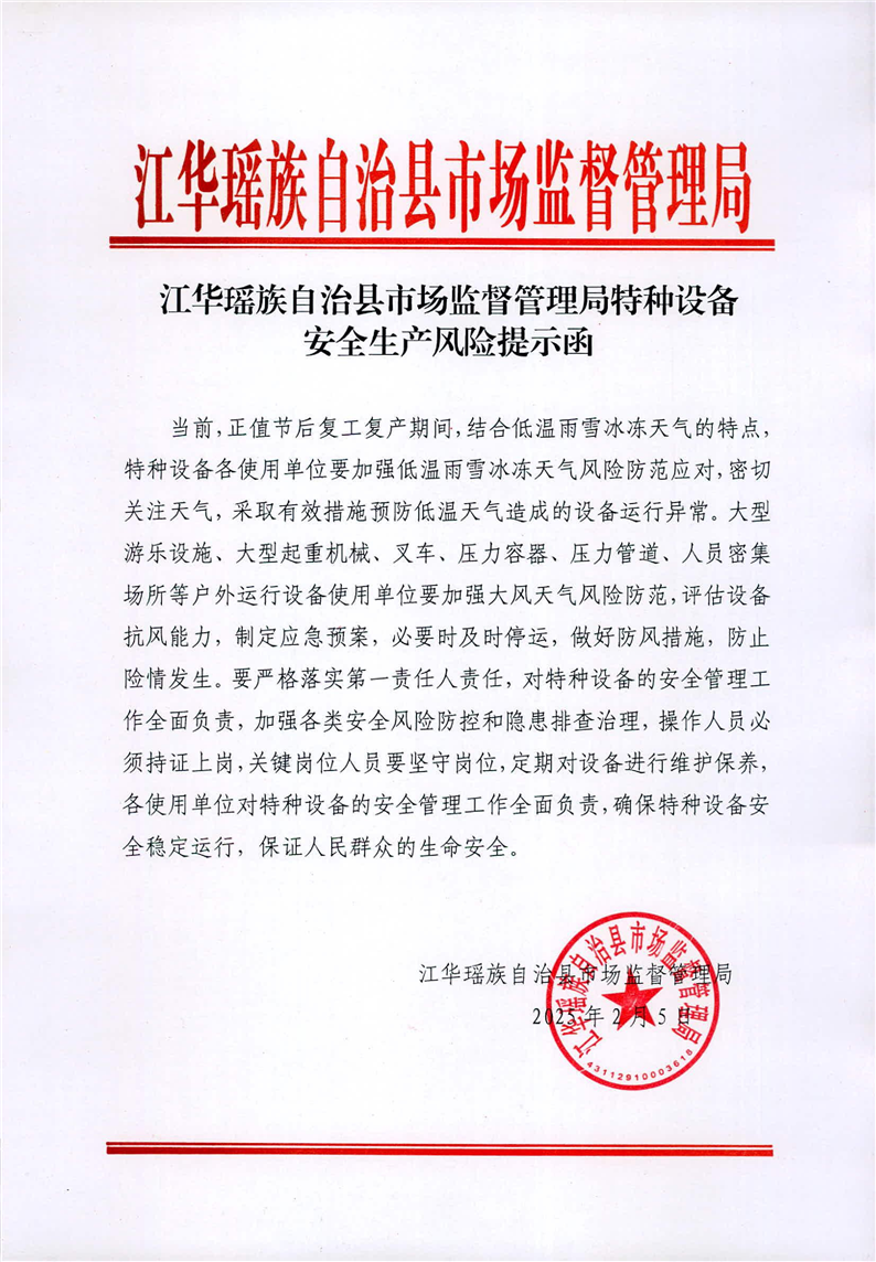 江华瑶族自治县市场监督管理局特种设备安全生产风险提示函