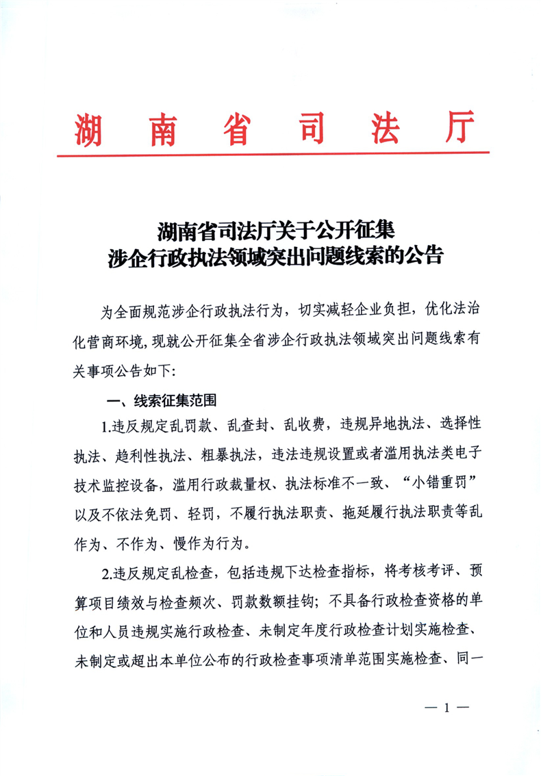 湖南省司法厅关于公开征集涉企行政执法领域突出问题线索的公告