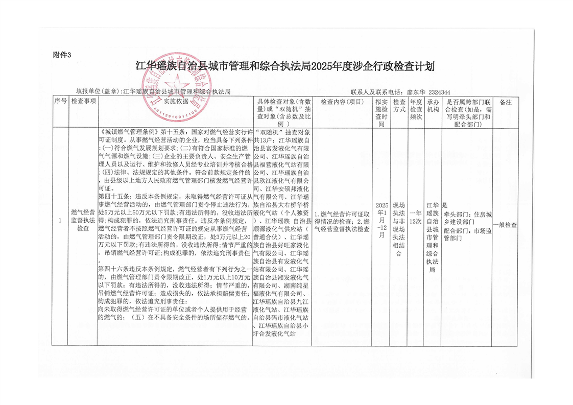 江华瑶族自治县城市管理和综合执法局2025年度涉企行政检查计划