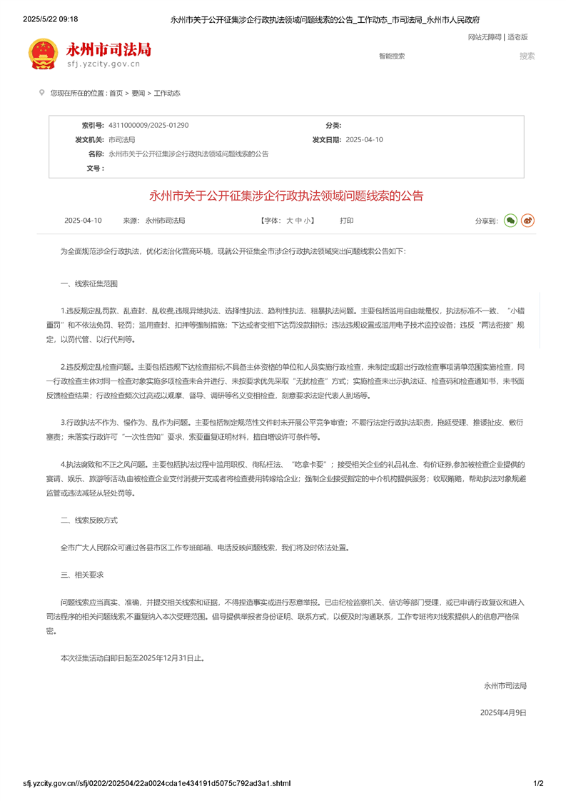 永州市关于公开征集涉企行政执法领域问题线索的公告