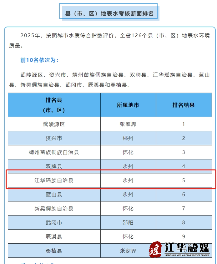 2月26日,省生态环境厅发布一月份全省各市州、县区生态环境质量排名。全省126个行政县(市、区)中,按照水质综合指数评价,地表水环境质量江华排名全省前10名中的第5名。