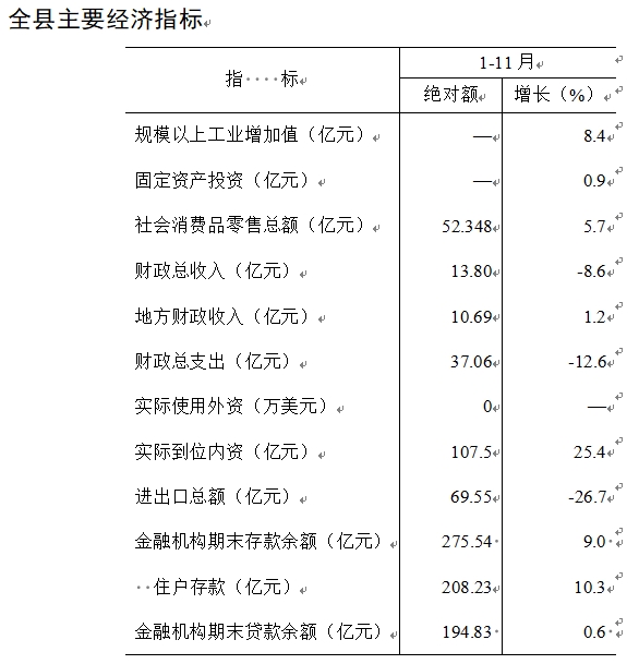 财政和金融。1-11月,全县完成财政总收入13.80亿元,同比下降8.6%。其中,地方财政收入10.69亿元,同比增长1.2%。非税收入占地方财政收入的比重为30.7%。全县财政支出37.1亿元,下降12.6%。其中,全县民生支出27.3亿元,占财政总支出的73.5%。11月末,全县金融机构存款余额275.54亿元,增长9.0%。其中,住户存款余额208.23亿元,增长10.3%。金融机构贷款余额194.83亿元,增长0.6%。
