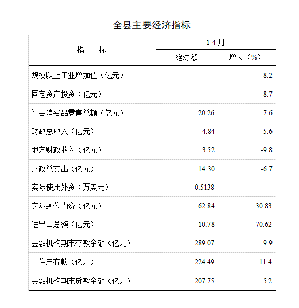 财政和金融。1-4月,全县完成财政总收入4.84亿元,同比下降5.6%。其中,地方财政收入3.52亿元,同比下降9.8%。非税收入占地方财政收入的比重为41.3%。全县财政支出14.30亿元,下降6.7%。其中,全县民生支出10.89亿元,占财政总支出的76.2%。4月末,全县金融机构存款余额289.07亿元,增长9.9%。其中,住户存款余额224.49亿元,增长11.4%。金融机构贷款余额207.75亿元,增长5.2%。