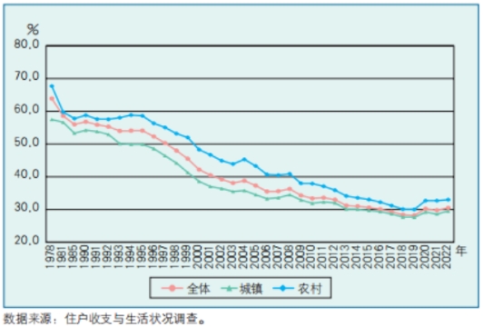 图1 1978—2022年全国及分城乡居民恩格尔系数