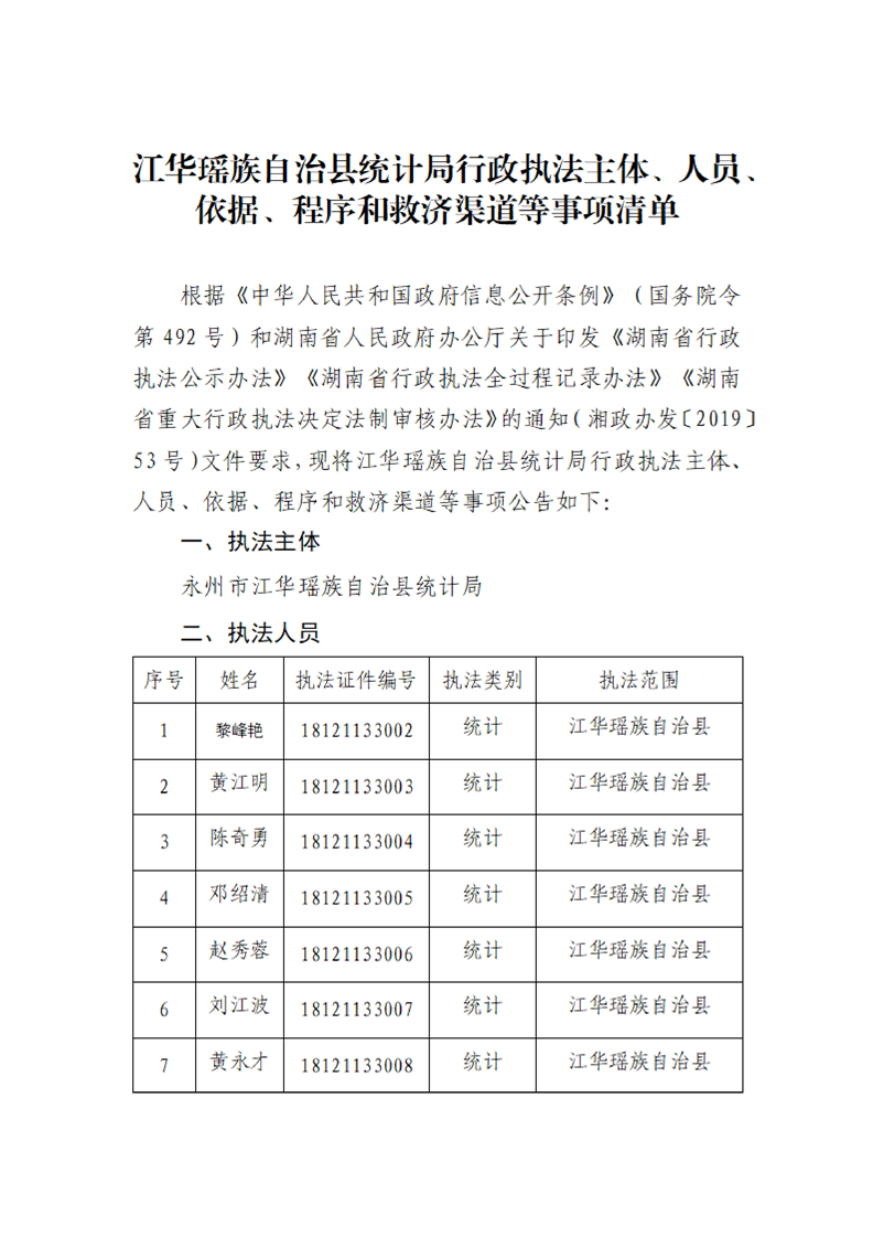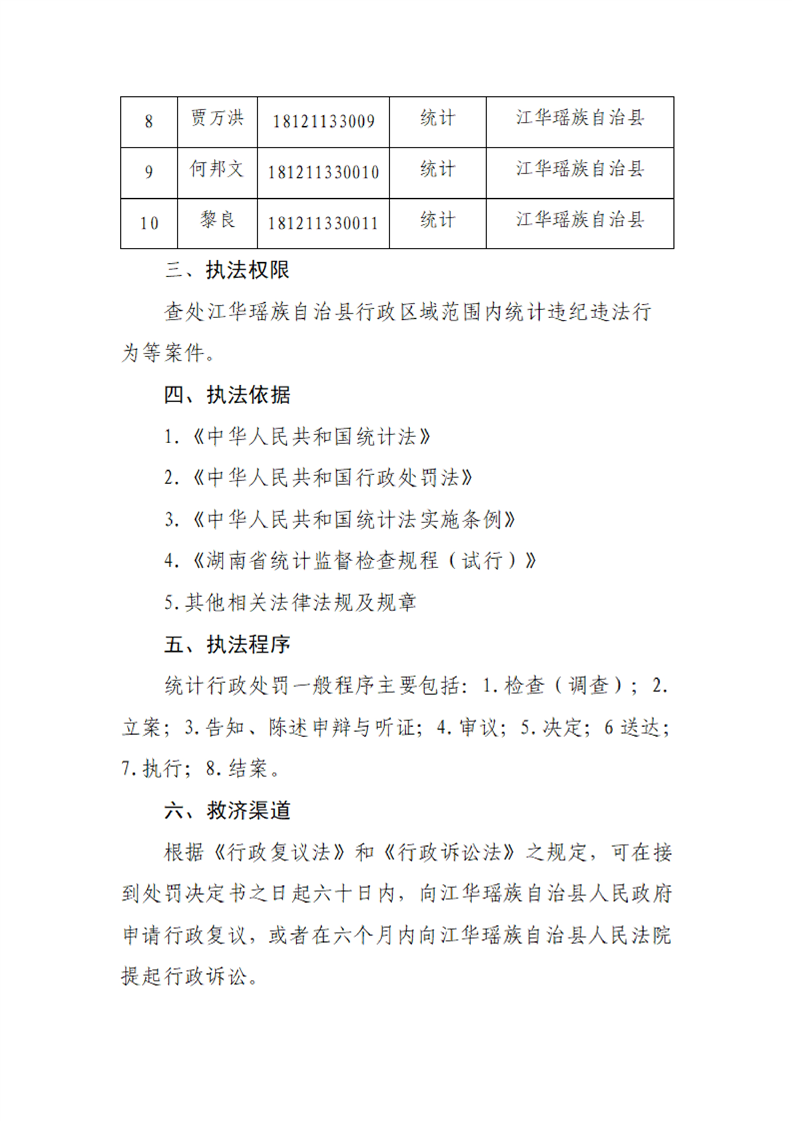 江华瑶族自治县统计局行政执法主体、人员、依据、程序和救济渠道等事项清单