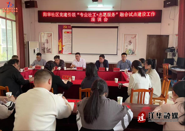 在座谈会上,文嵩听取了县委社会工作部关于全国党建引领“专业社工+志愿服务”融合试点工作的情况汇报。阳华社区党委负责人表态,在县委的领导和相关部门的支持帮助下,抓好“三个聚集、三个链接、三个突出、三个创新”,有底气、有信心把阳华社区建设成融合试点的典型社区。