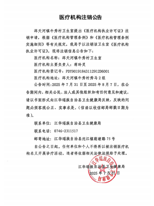 涔天河镇牛秀村卫生室注销公告