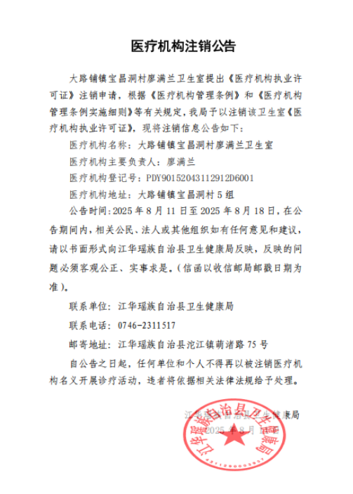 大路铺镇宝昌洞村廖满兰卫生室注销公示