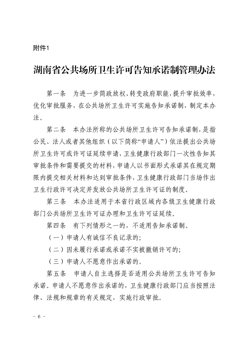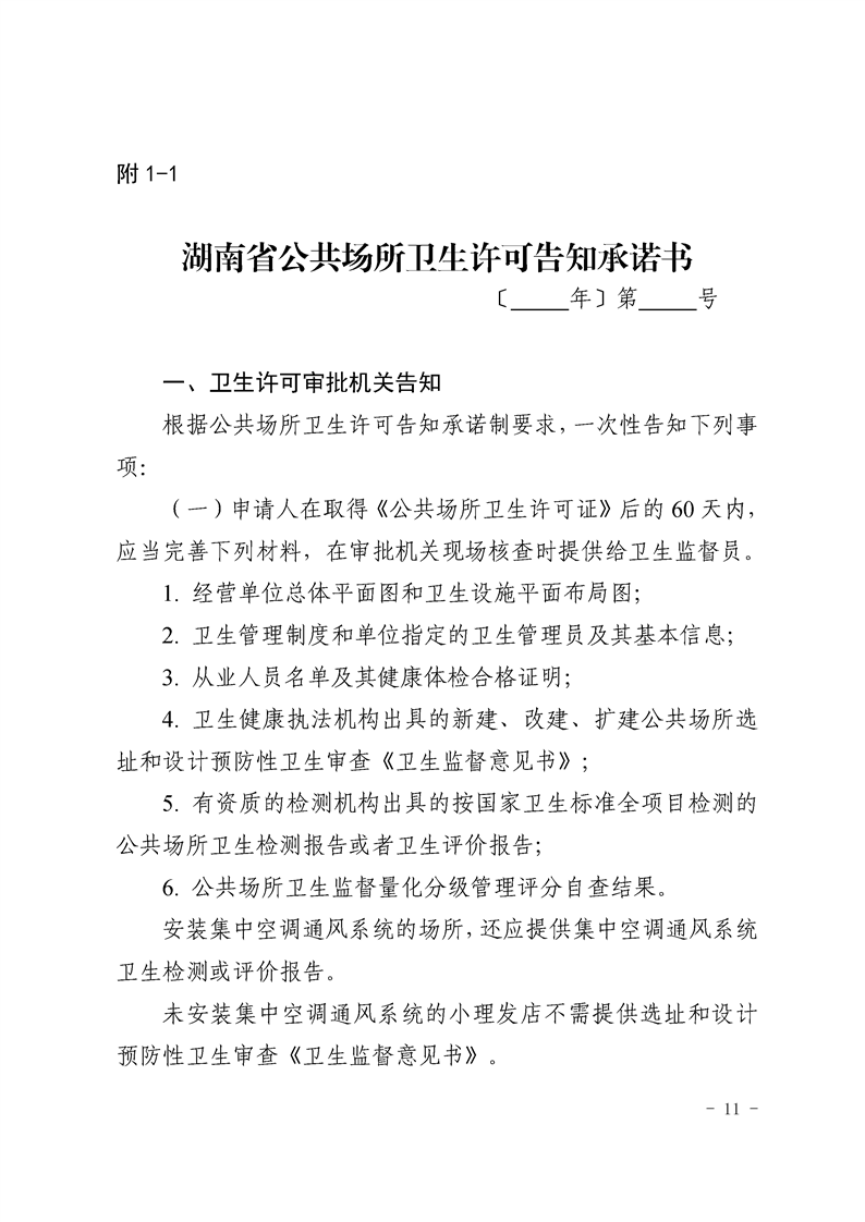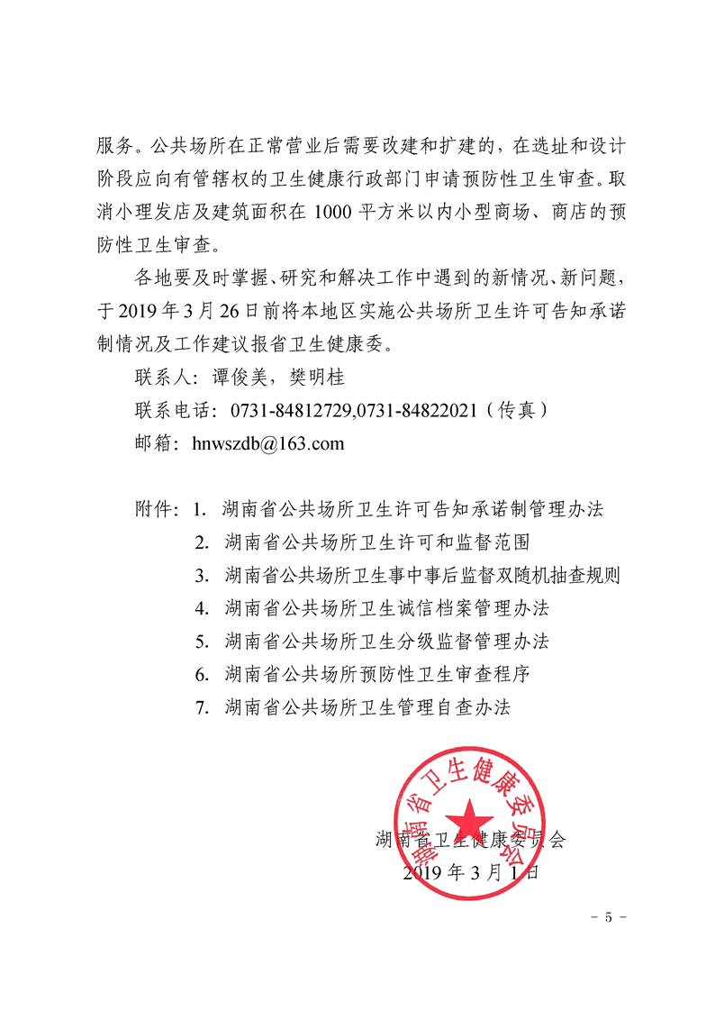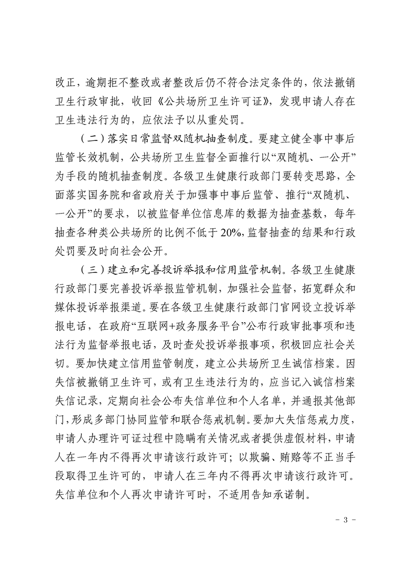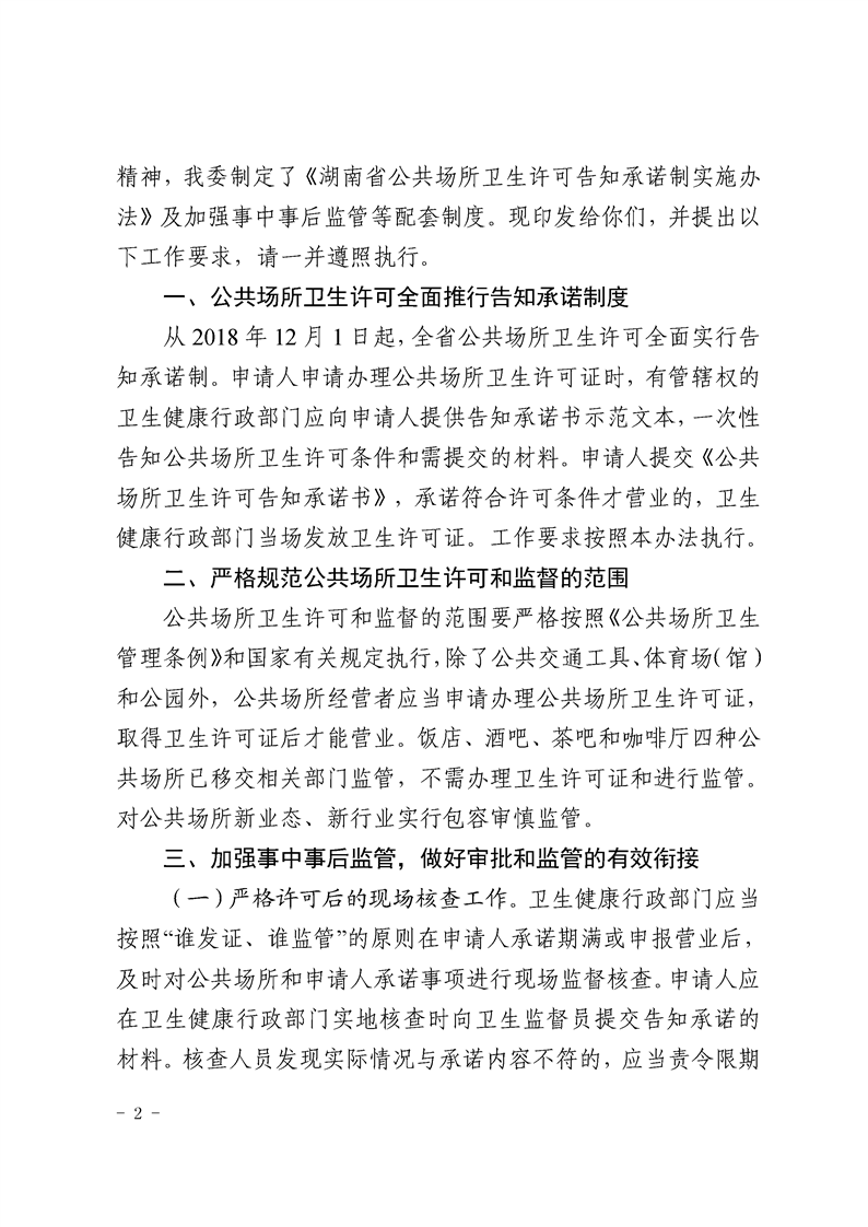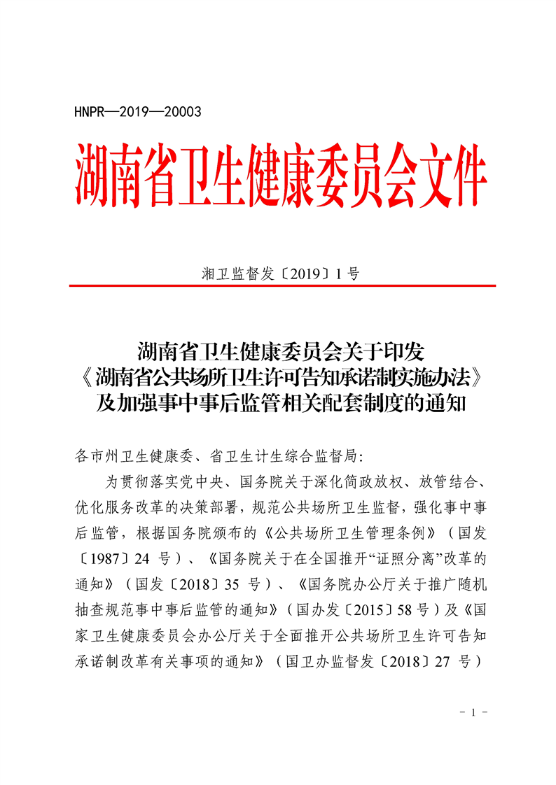 《湖南省卫生健康委员会关于印发湖南省公共场所卫生许可告知承诺制实施办法及加强事中事后监管相关配套制度的通知》湘卫监督发〔2019〕1号