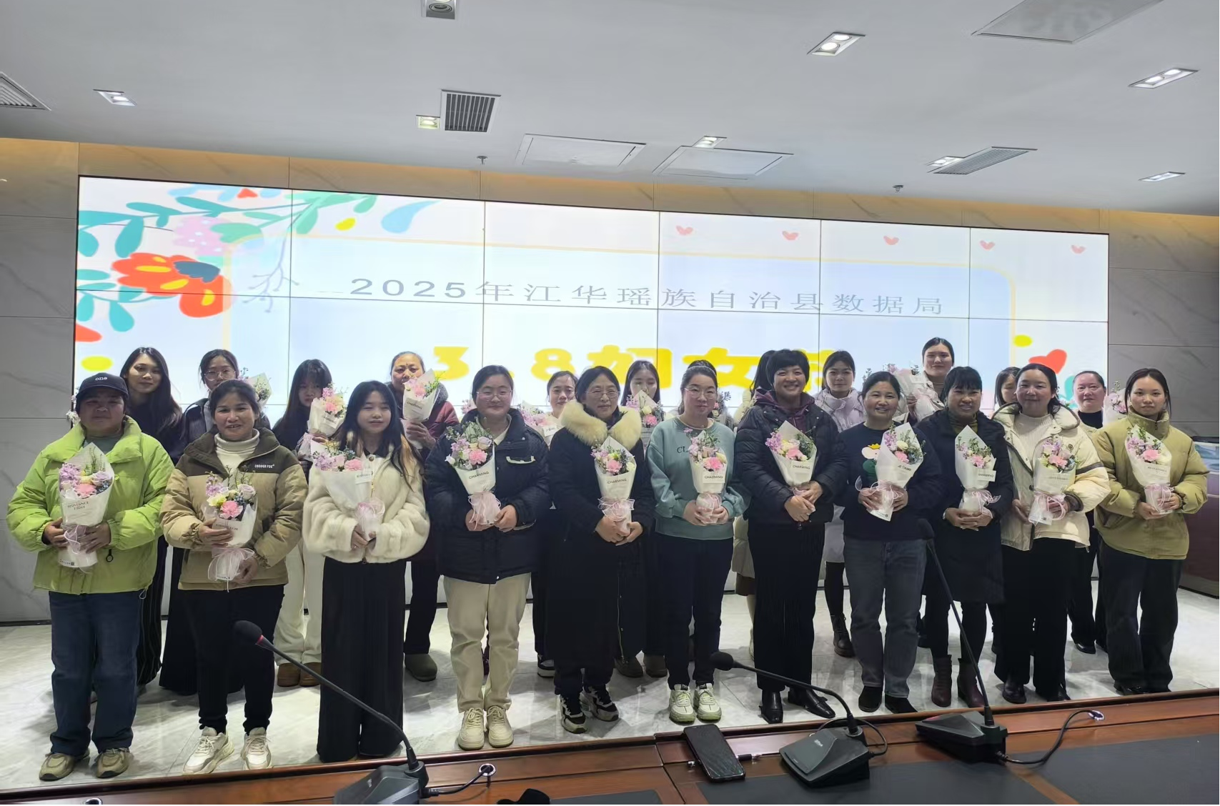 鲜花寄语暖人心 凝心聚力向未来。在温馨的献花环节,局领导班子为全体女同胞送上象征祝福的康乃馨,并合影留念。活动还为每位参与者精心准备了陶瓷杯、洗衣液、牙膏等实用奖品,现场洋溢着温馨与欢乐。