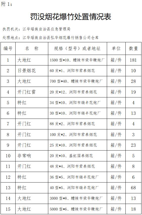 (二)标的物详情:该拍卖烟花爆竹存放在江华瑶族自治县弘华烟花爆竹销售公司仓库内,系我局于2023年8月份以来依法扣押没收的非法储存经营烟花爆竹。具体情况请意向买受人到江华瑶族自治县弘华烟花爆竹销售公司仓库实地查看。