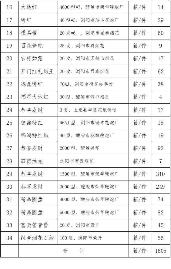 (一)拍卖标的:涉案没收的符合安全标准的合格烟花爆竹1605箱/件,按现状拍卖,具体规格见附表。