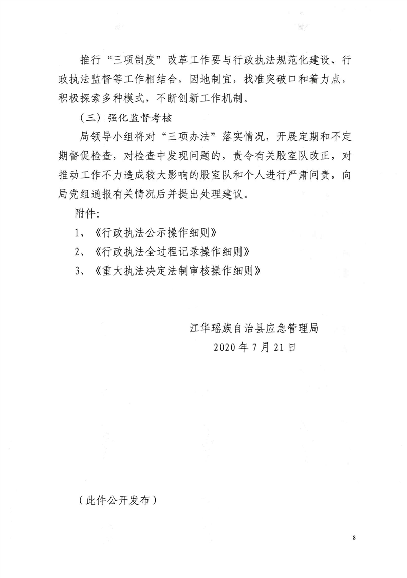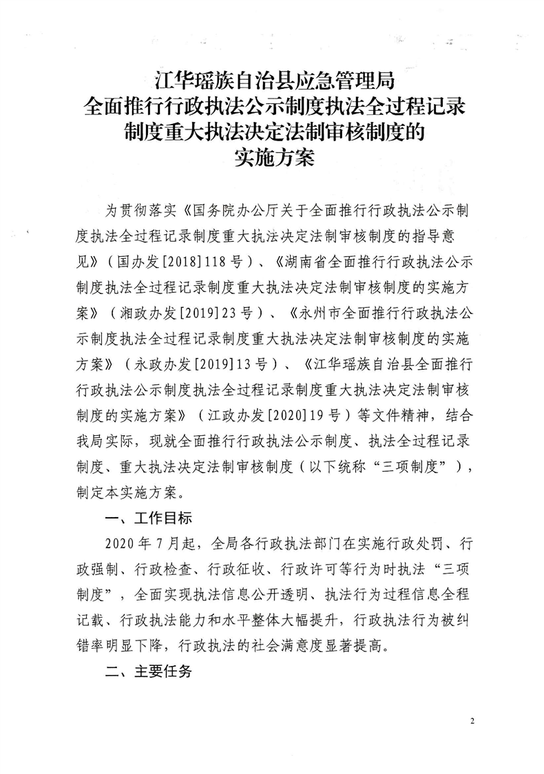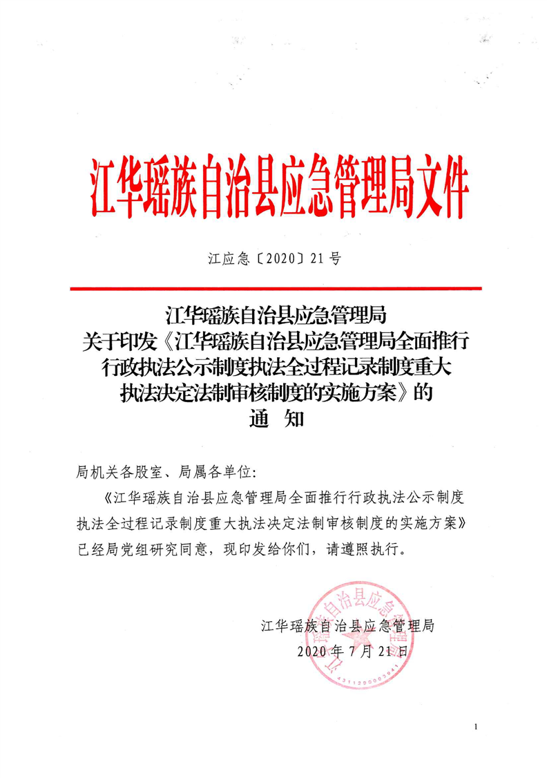 江华瑶族自治县应急管理局关于全面推行行政执法公示制度、执法全过程记录制度、重大执法决定法制审核制度的实施方案的通知
