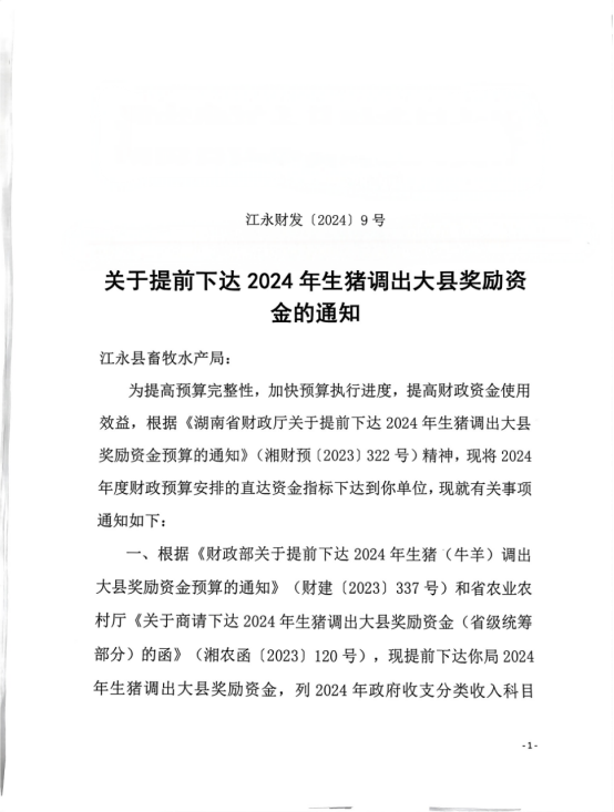 关于提前下达2024年生猪调出大县奖励资金的通知(江永财发〔2024〕9号)