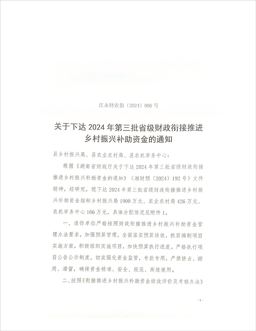 关于下达2024年第三批省级财政衔接推进乡村振兴补助资金的通知(江永财农指〔2024〕006号)