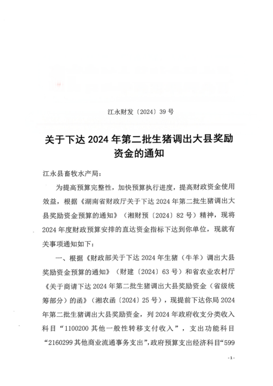 关于下达2024年第二批生猪调出大县奖励资金的通知(江永财发〔2024〕39号)