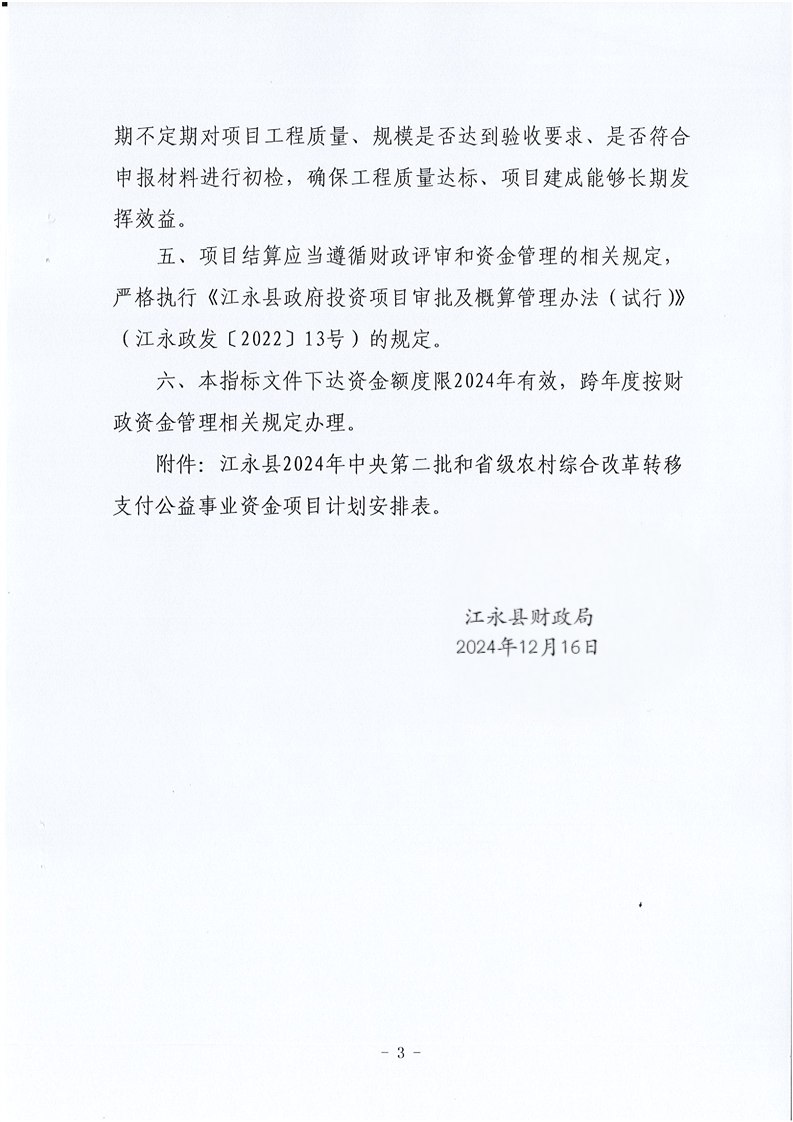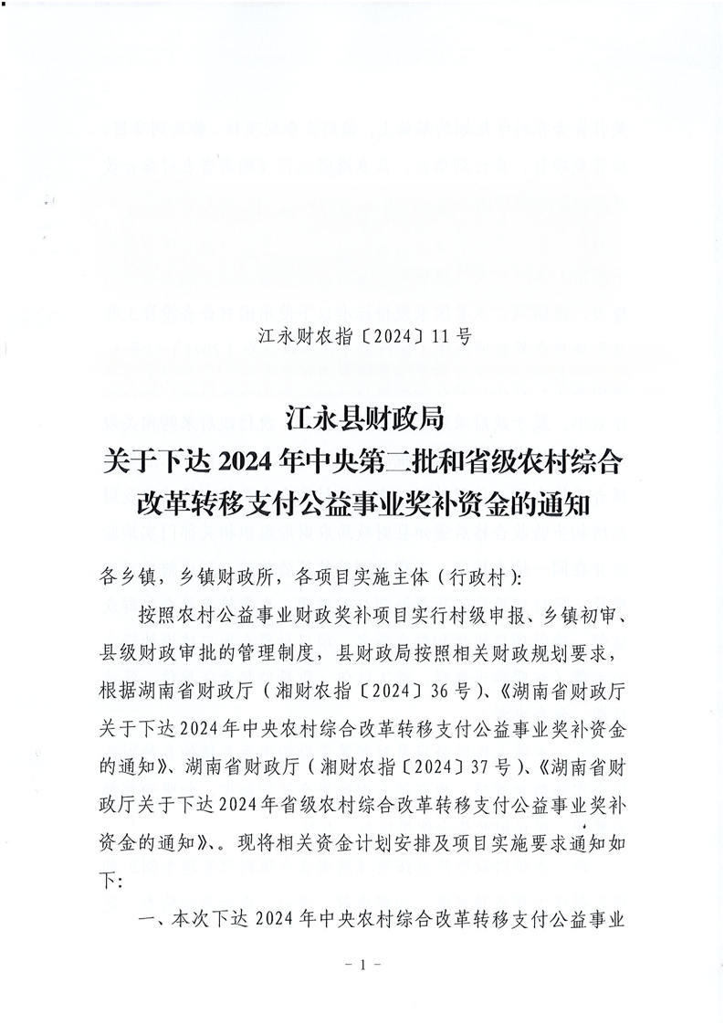江永县财政局关于下达2024年中央第二批和省级农村综合改革转移支付公益事业奖补资金的通知