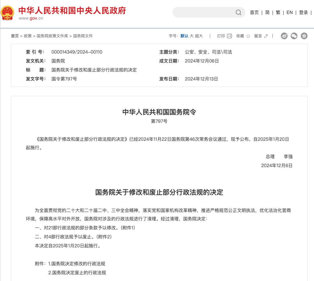 近日,《国务院关于修改和废止部分行政法规的决定》公布,自2025年1月20日起施行。此次修改的行政法规涉及《医疗器械监督管理条例》《麻醉药品和精神药品管理条例》《放射性药品管理办法》《中华人民共和国药品管理法实施条例》等多部医药领域法规。