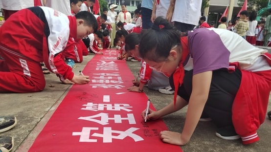 演练后,老师和学生们共同举行了“安全第一、珍爱生命、预防溺水、从我做起”签名活动。