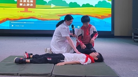 活动中,学校组织学生观看防溺水安全教育片,学习背诵防溺水“七不两会”,并向学生们详细讲解了防溺水的关键措施。接着让两名学生分别扮演落水者和施教者,模拟溺水、呼救、施救等环节进行了演示教育。