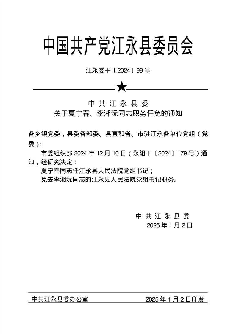 中共江永县委关于夏宁春、李湘沅同志职务任免的通知