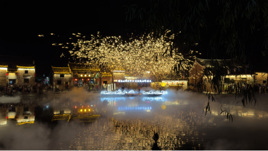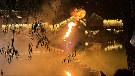 夜幕降临,勾蓝瑶寨的黄家水系沿线灯火璀璨,古街石板路在灯光映照下焕发光彩。随着非物质文化遗产代表性传承人挥动工具,千余度高温的铁水被击向夜空,金色火花在夜色中层层铺开,与水面倒影相映成趣。紧接着,国家级非遗火壶表演震撼亮相,传承人手持燃着炭火的火壶在石桥上翻飞游走,火星飞溅如巨龙吐息,引得现场游客阵阵惊叹与欢呼。