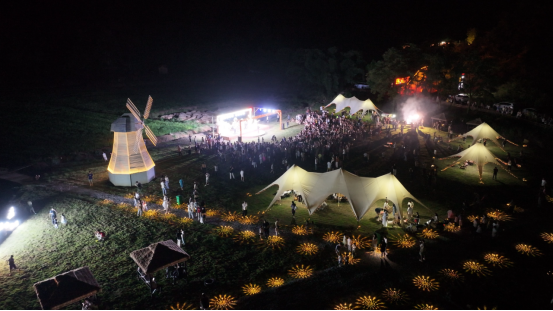 非遗表演余韵未消,花海稻田中的音乐节舞台便已亮起灯光。瑶族长歌与现代旋律碰撞融合,歌声伴随着晚风穿过金黄稻浪,形成独特的自然共鸣。台下观众或坐或立,在稻香中跟着节奏轻唱,不少游客举起手机记录这一美好瞬间,欢声笑语久久回荡。