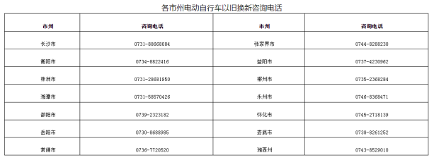 答:消费者如有疑问,可以通过各市州设立的电动自行车以旧换新补贴活动热线电话进行咨询。