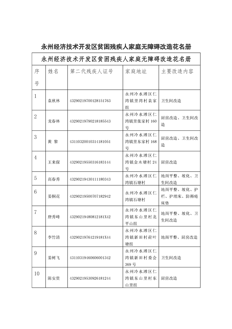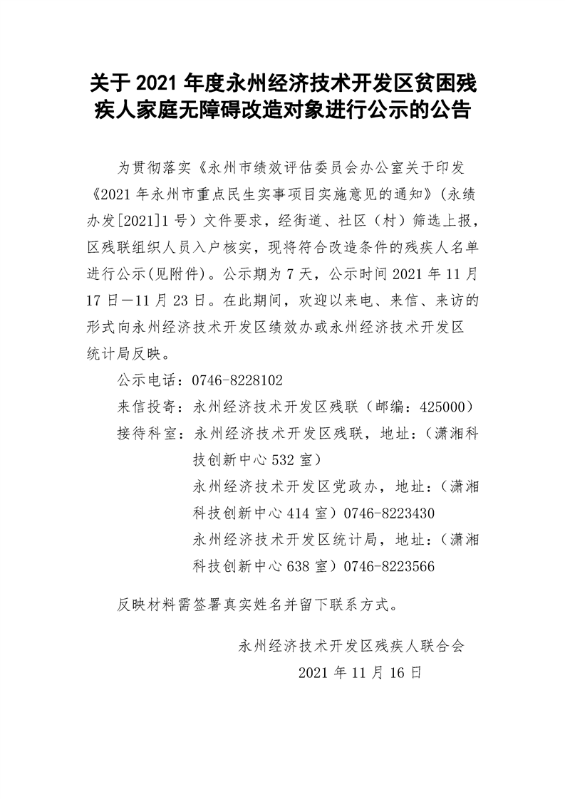 关于2021年度永州经济技术开发区贫困残疾人家庭无障碍改造对象进行公示的公告