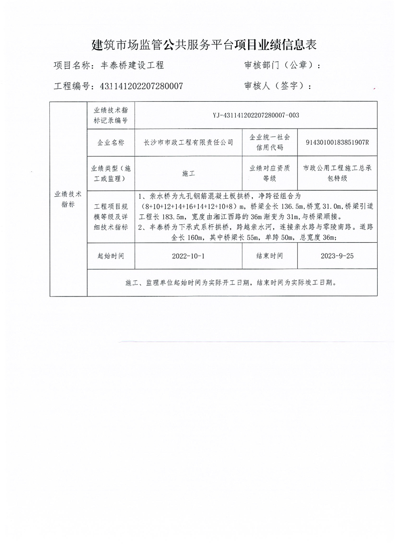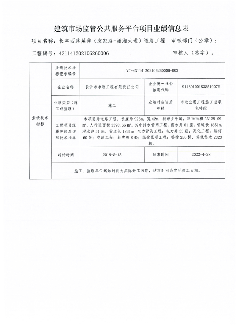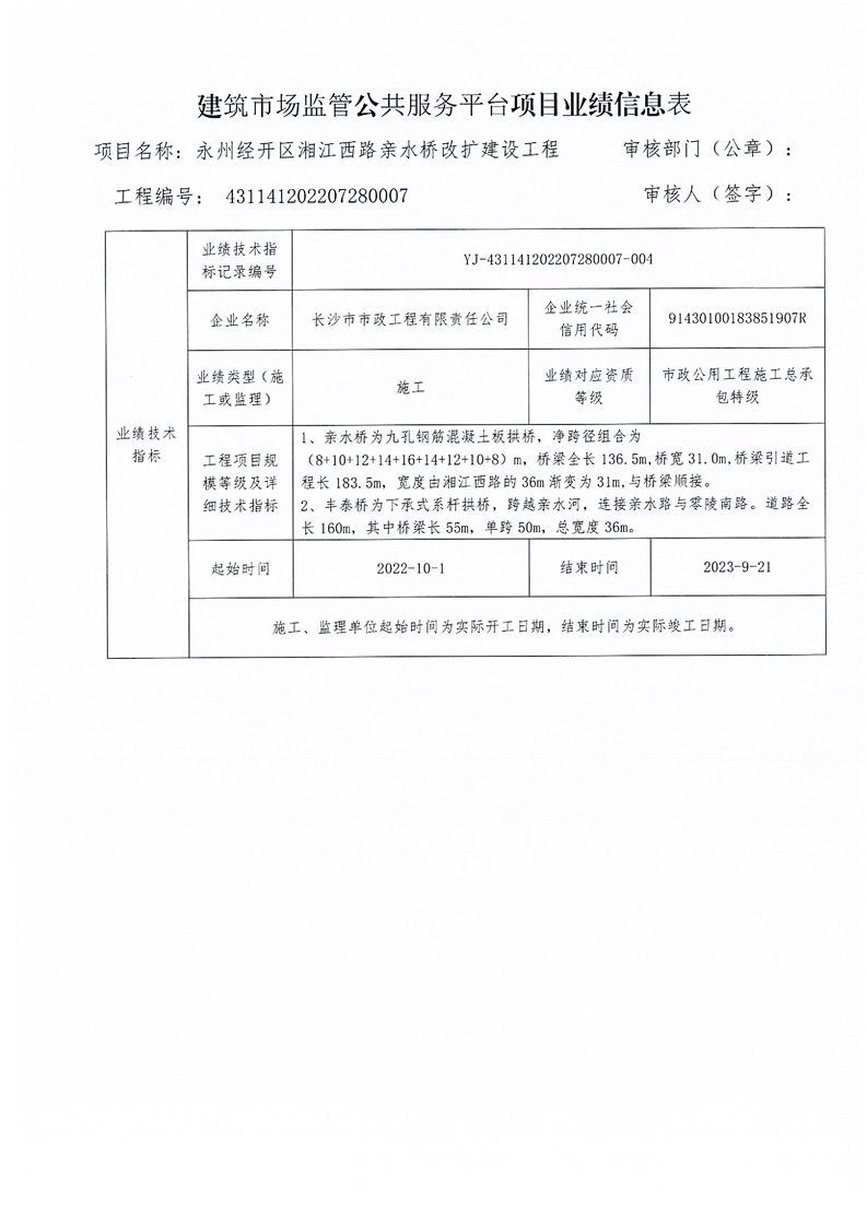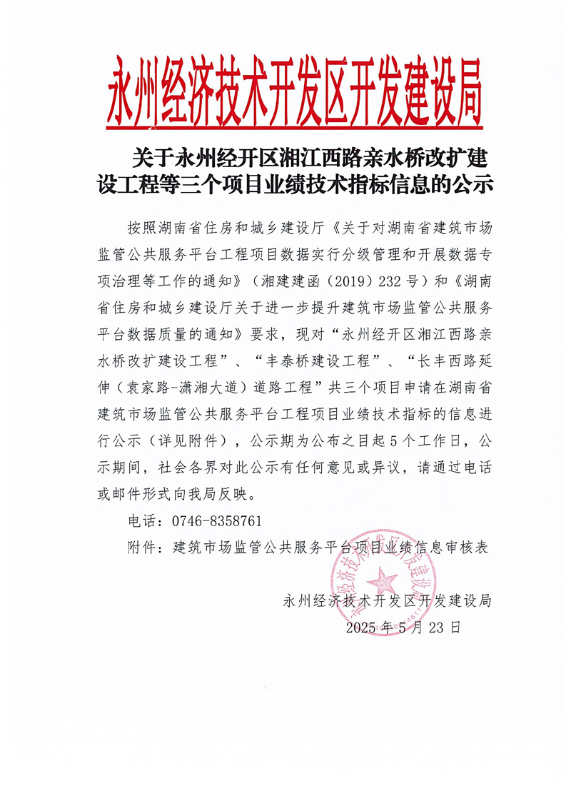 关于永州经开区湘江西路亲水桥改扩建设工程等三个项目业绩技术指标信息的公示