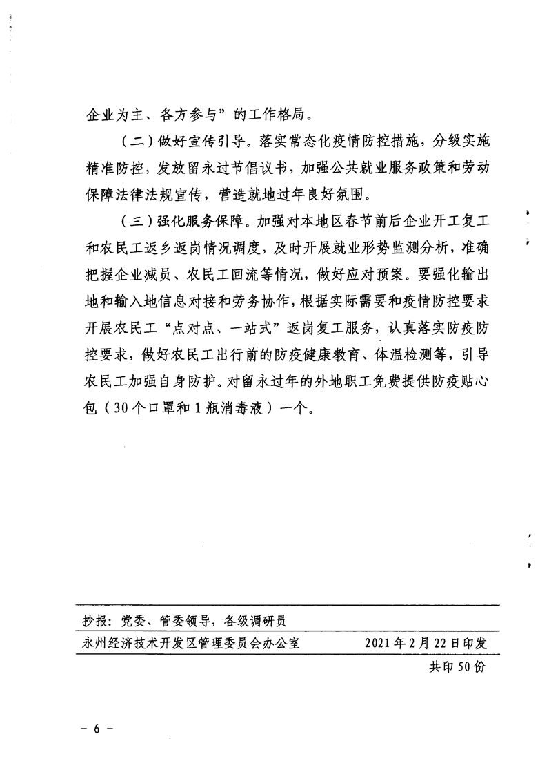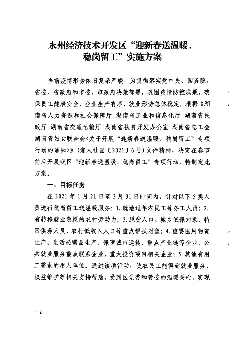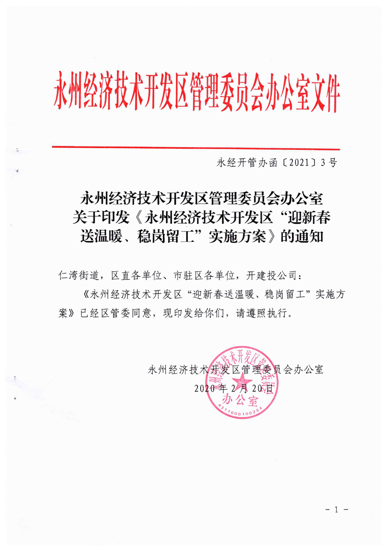 永州经济技术开发区管理委员会办公室关于印发《永州经济技术开发区“迎新春送温暖、稳岗留工”实施方案》的通知