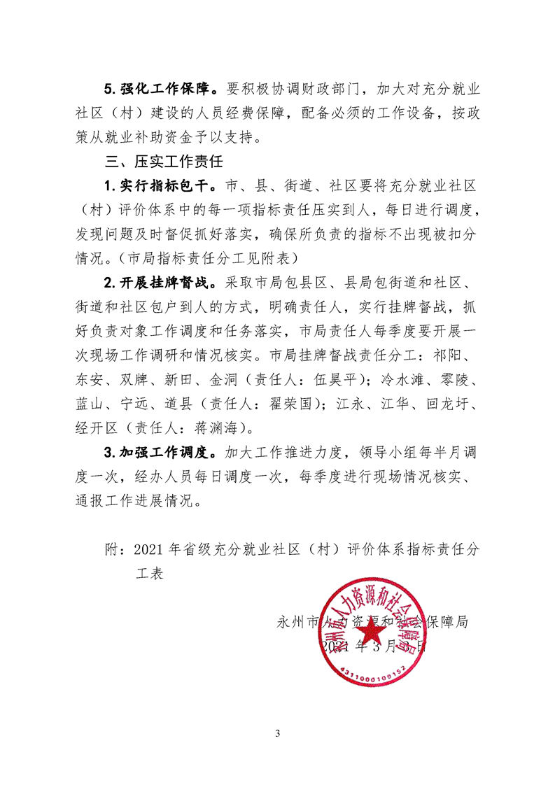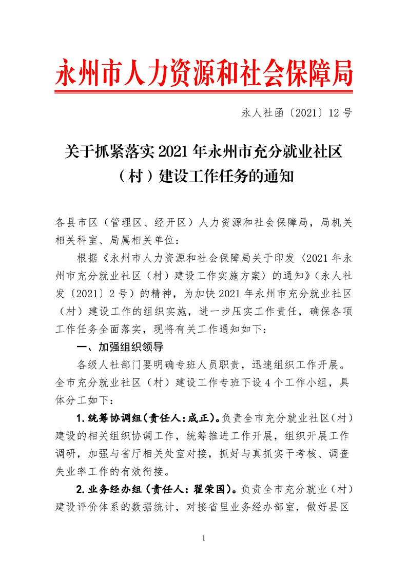 关于抓紧落实2021年永州市充分就业社区(村)建设工作任务的通知