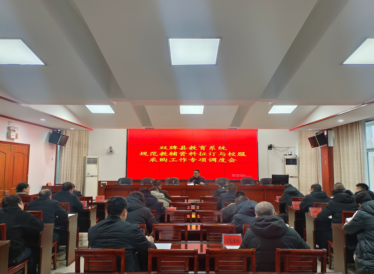 (通讯员 盘海军)2 月 6 日上午,双牌县教育局召开 2026 年全县教育系统规范教辅资料征订与校服采购工作专项调度会。县教育局班子成员、总督学张斌主持会议并作工作部署,局机关教研室、基教股、体卫艺股负责人及全县各中小学党组织书记、校长参加会议。