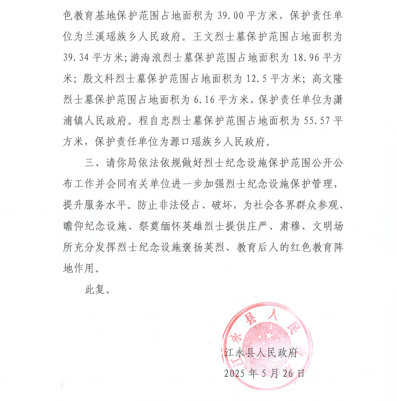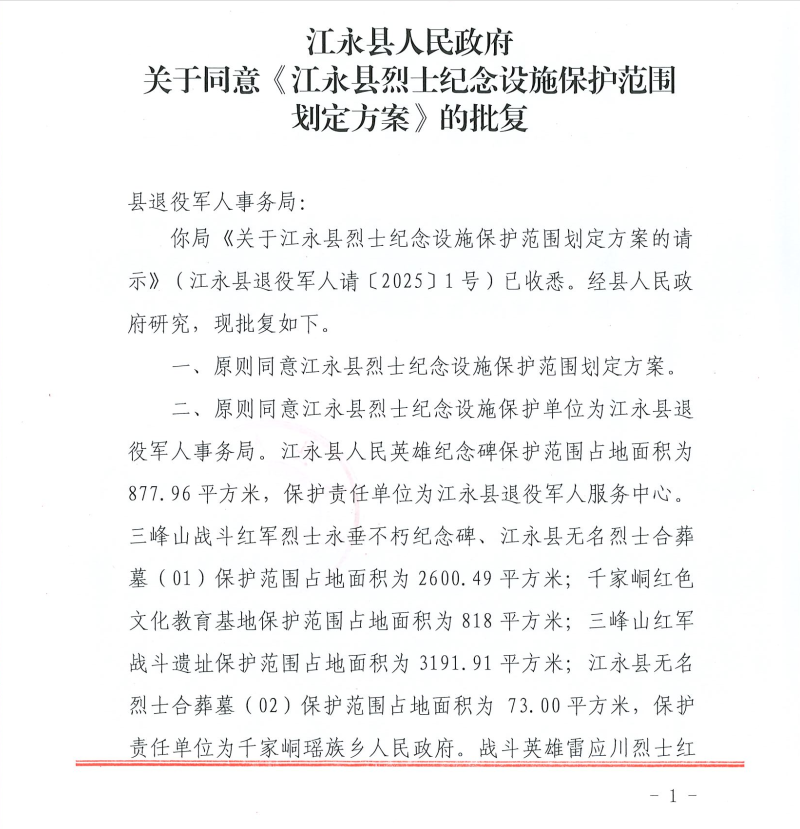 江永县人民政府关于同意《江永县烈士纪念设施保护范围划定方案》的批复