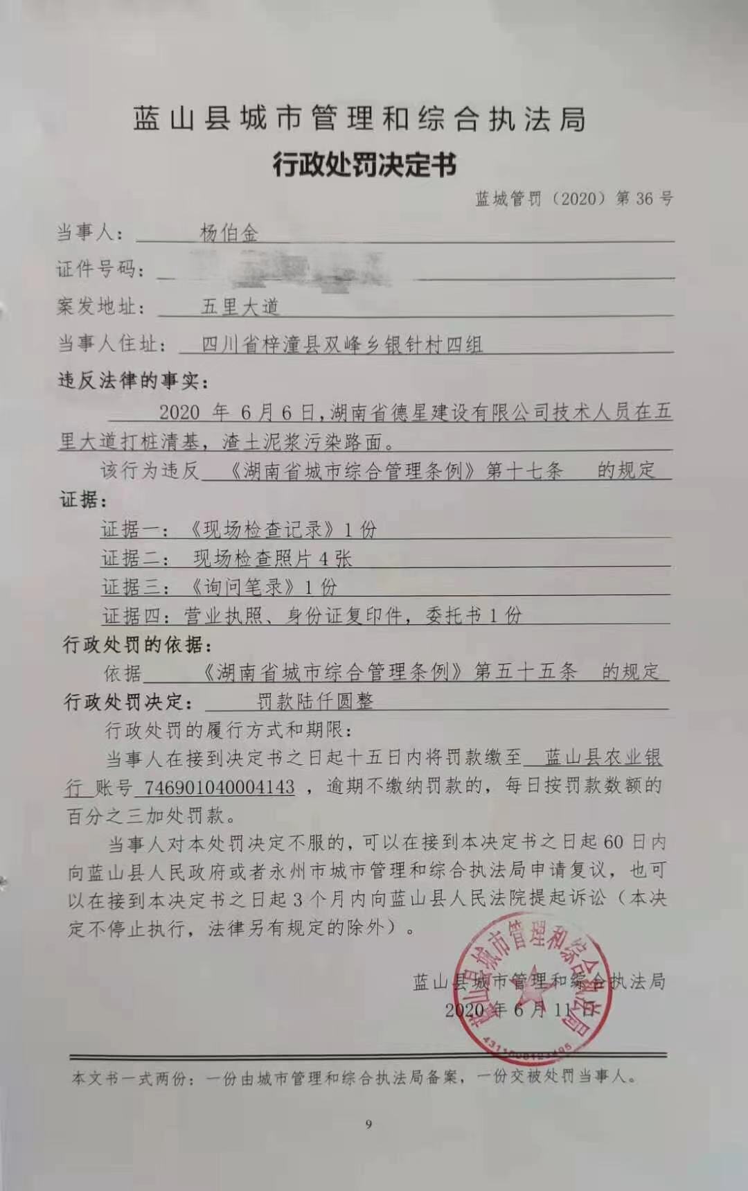 关于湖南省德星建设有限公司技术人员在五里大道打桩清基,渣土泥浆污染路面的处罚