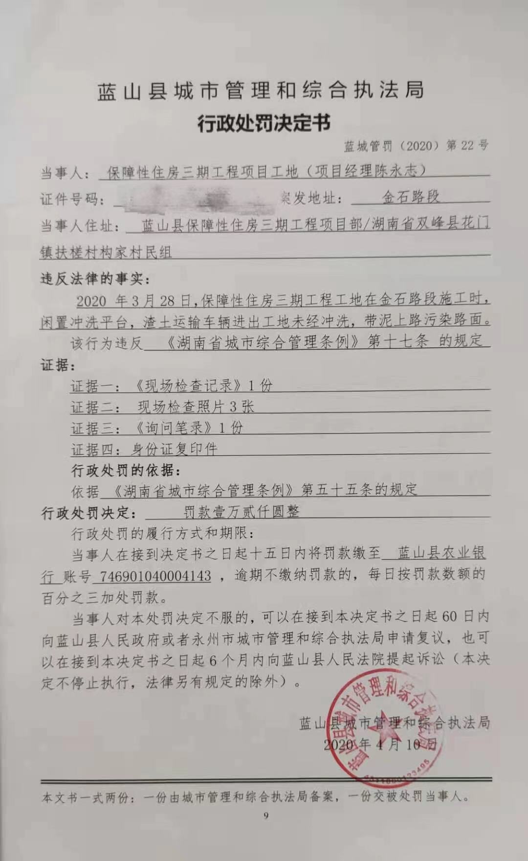 关于保障性住房三期工程项目工地在金石路段施工时,闲置冲洗平台,渣土运输车辆进出工地未冲洗,带泥上路污染路面的处罚