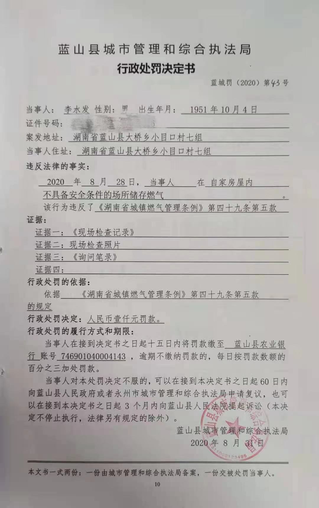 关于李水发在不具备安全条件下的场所储存燃气的处罚