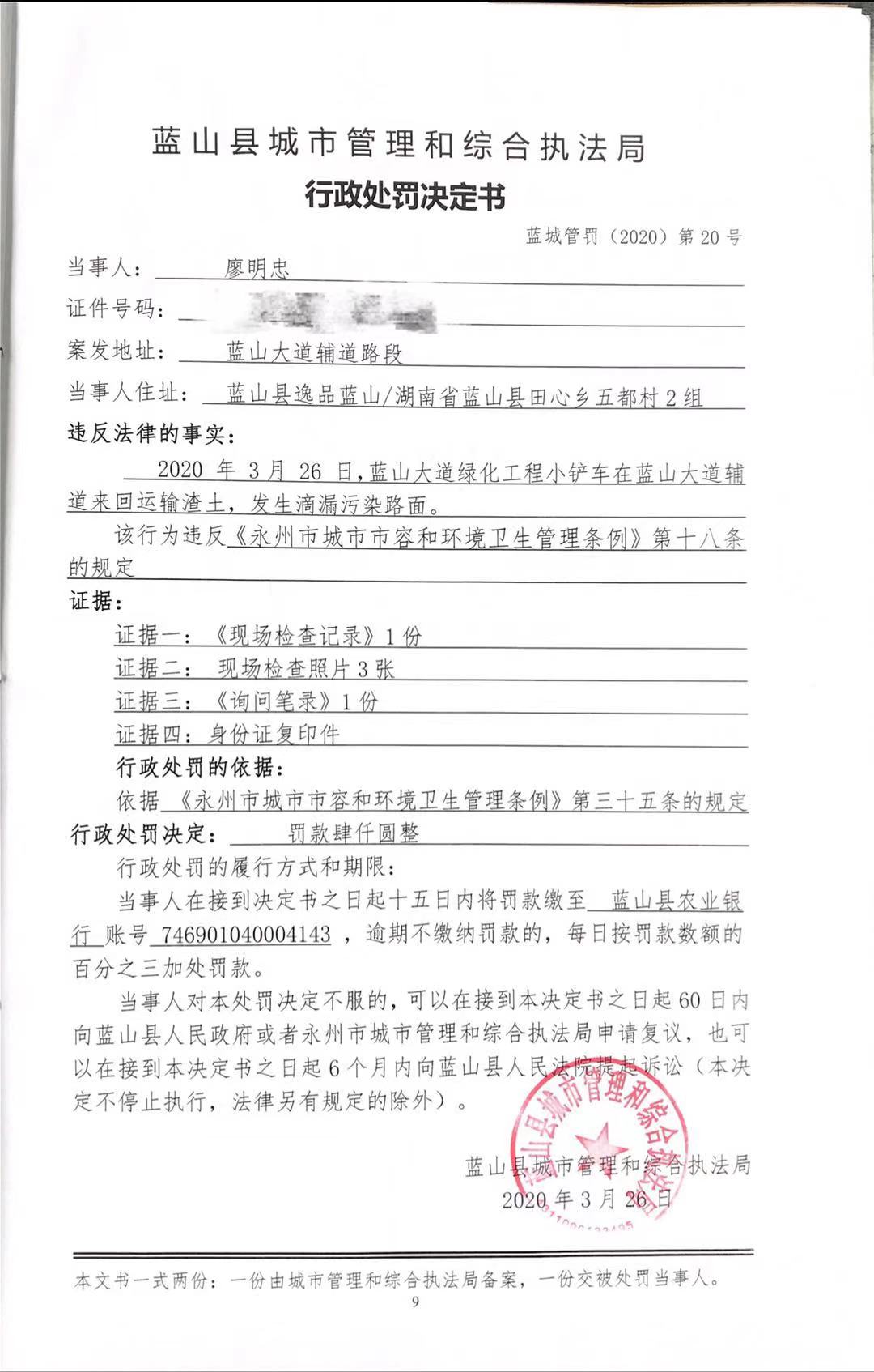 关于廖明忠在蓝山大道来回运输渣土发生滴漏污染路面的处罚