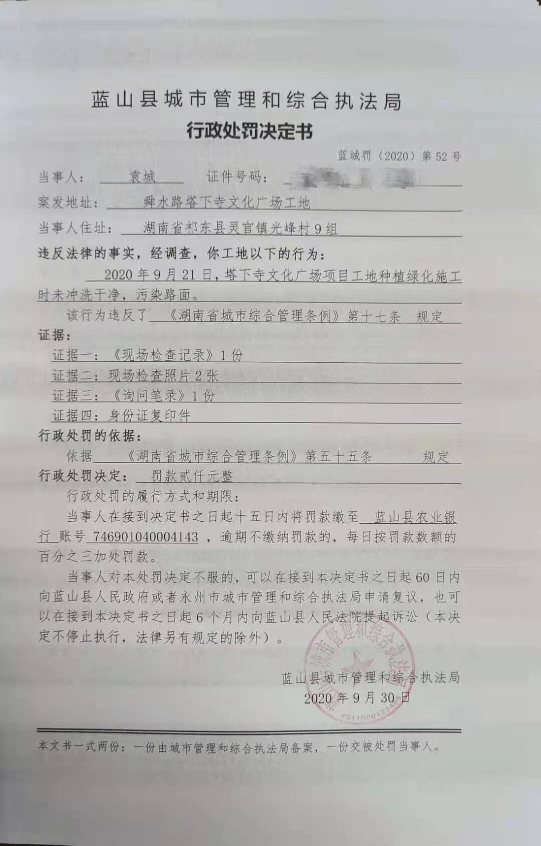 关于塔下寺文化广场项目工地种植绿化施工时未冲洗干净,污染路面的处罚